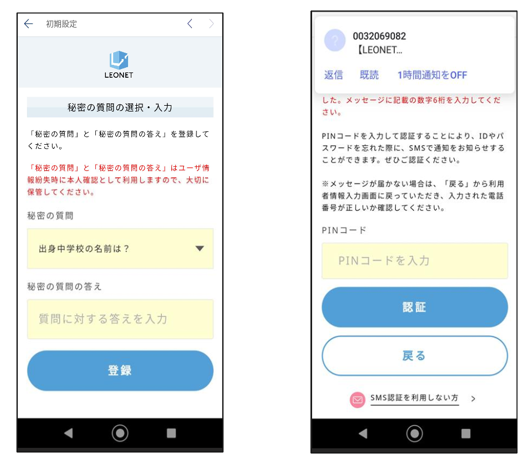 ⑦【④의 이용자 정보 등록 화면】에서, 전화 번호를 입력하지 않고 왼쪽의 「비밀 질문」을, 설정한 경우는 오른쪽의 전화 번호로 발송된 PIN코드를 입력하는 각기의 화면으로 이동합니다.