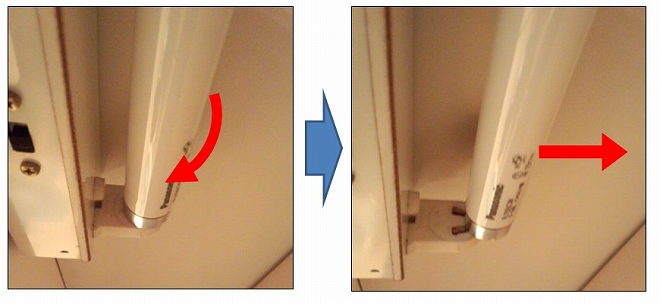 형광등을 안쪽으로 90도 돌린 후 본체에서 분리합니다.